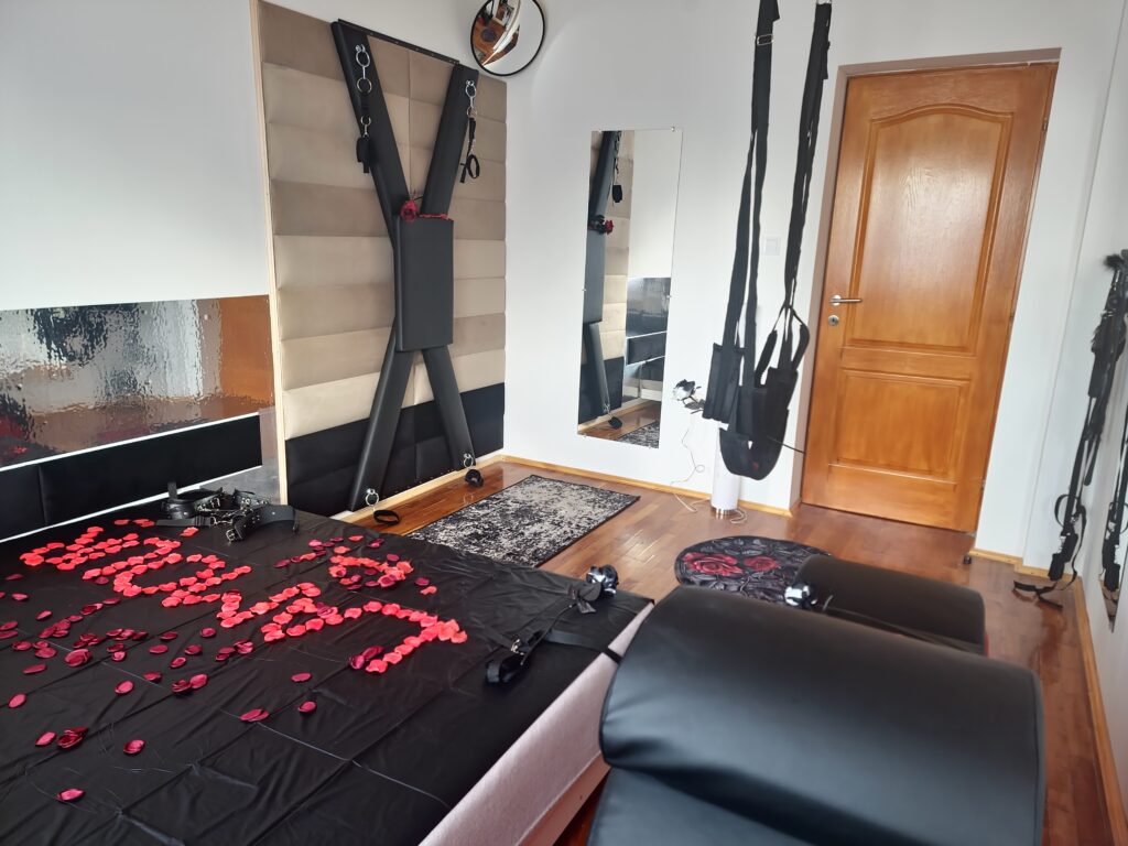 Fekete BDSM szoba - rabszolga ketrec, kámaszútra ágy, paskoló pad, tantra hinta, kényszerzubbony