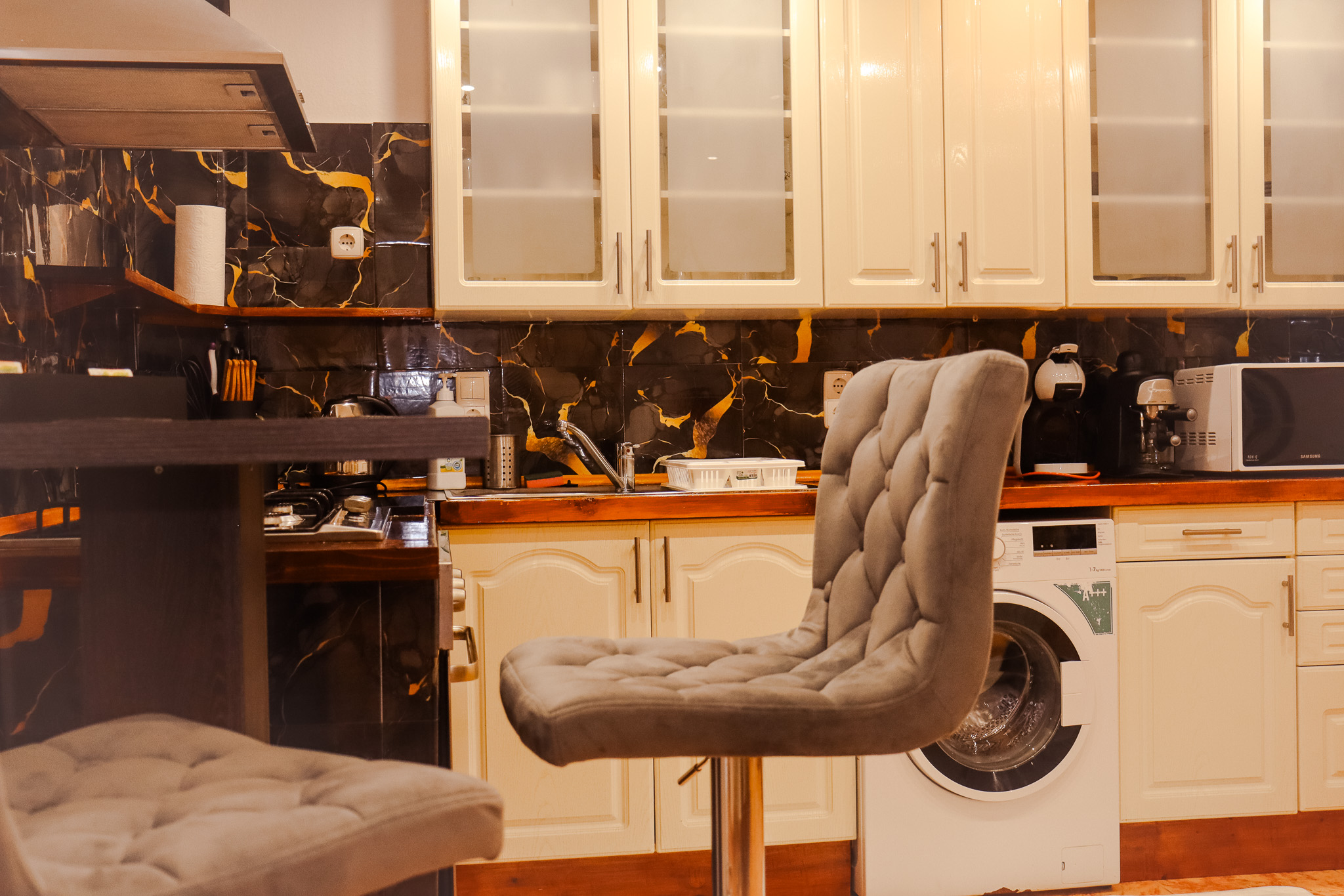 - Teljesen felszerelt konyha: kétféle kávéfőző, vízforraló, mikrohullámú sütő, kenyérpirító, fagyasztós hűtőszekrény, mosógép, teljes edény- és étkészlet.